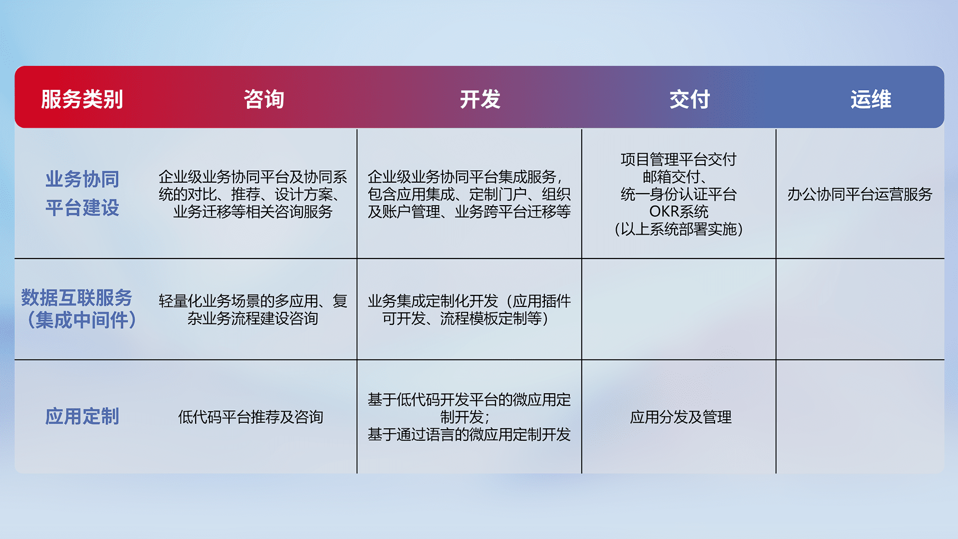 针对钉钉、、、企微、、IDaas等平台级产品提供产品的规划、、方案、、、交付、、、定制化开发等服务,,实现如统一协同办公、、智能客户服务、、、混合会议管理、、智能数据查询、、、等业务场景,,,实现数字化转型。。。。