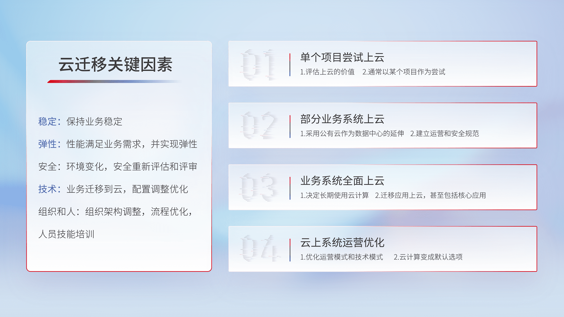结合实际业务,,,,从规划设计、、、云平台选型、、、、云原生改造、、、、数据迁移、、、、集成交付,,迁移全过程为客户识别最佳上云路径,,,,做好风险识别管理,,,设计网络架构、、身份权限、、、安全审计合规、、操作审计、、日志审计、、、、监控告警策略、、多站点容灾设计等,,,对云上基础设施进行整体规划,,,,提升IT治理水平,,,以满足弹性、、、高可用、、高性能的需求。。