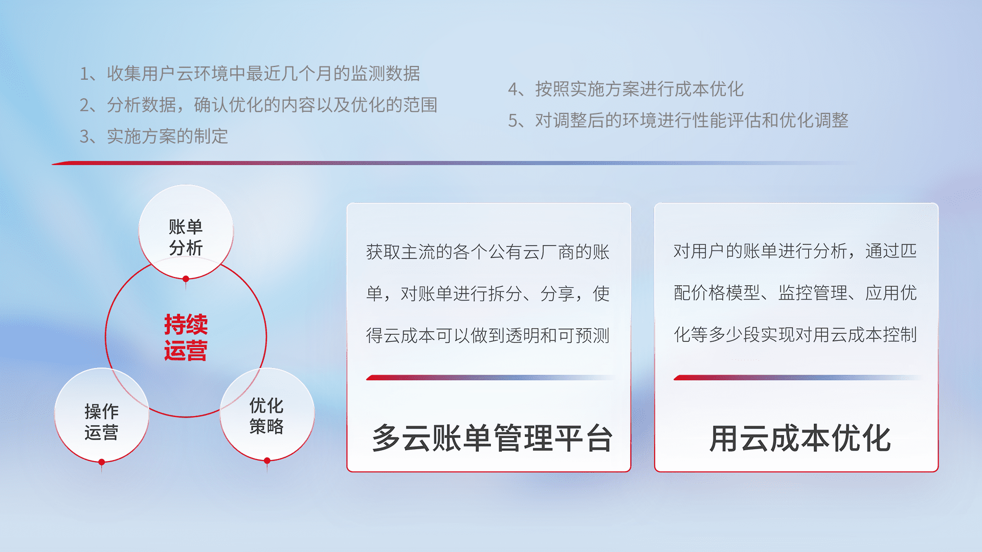 通过多云纳管,,以统一的资源数据模型把客户的云资源进行抽象和封装,,进而实现对多云资源的统一操作,,,,保障云资源管理的可靠性、、、、稳定性与可用性。。量身定制化运维内容,,,配置、、、开发运维、、、、补丁管理、、备份、、、监控、、、认证和访问管理、、、审计和日常巡检等,,,保障在用云过程中的可靠度,,稳定度以及高可用率。。